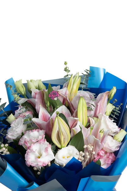 Arrangement Style: A charming blend of delicate eustoma and elegant lilies, designed to evoke freshness, grace, and romance.