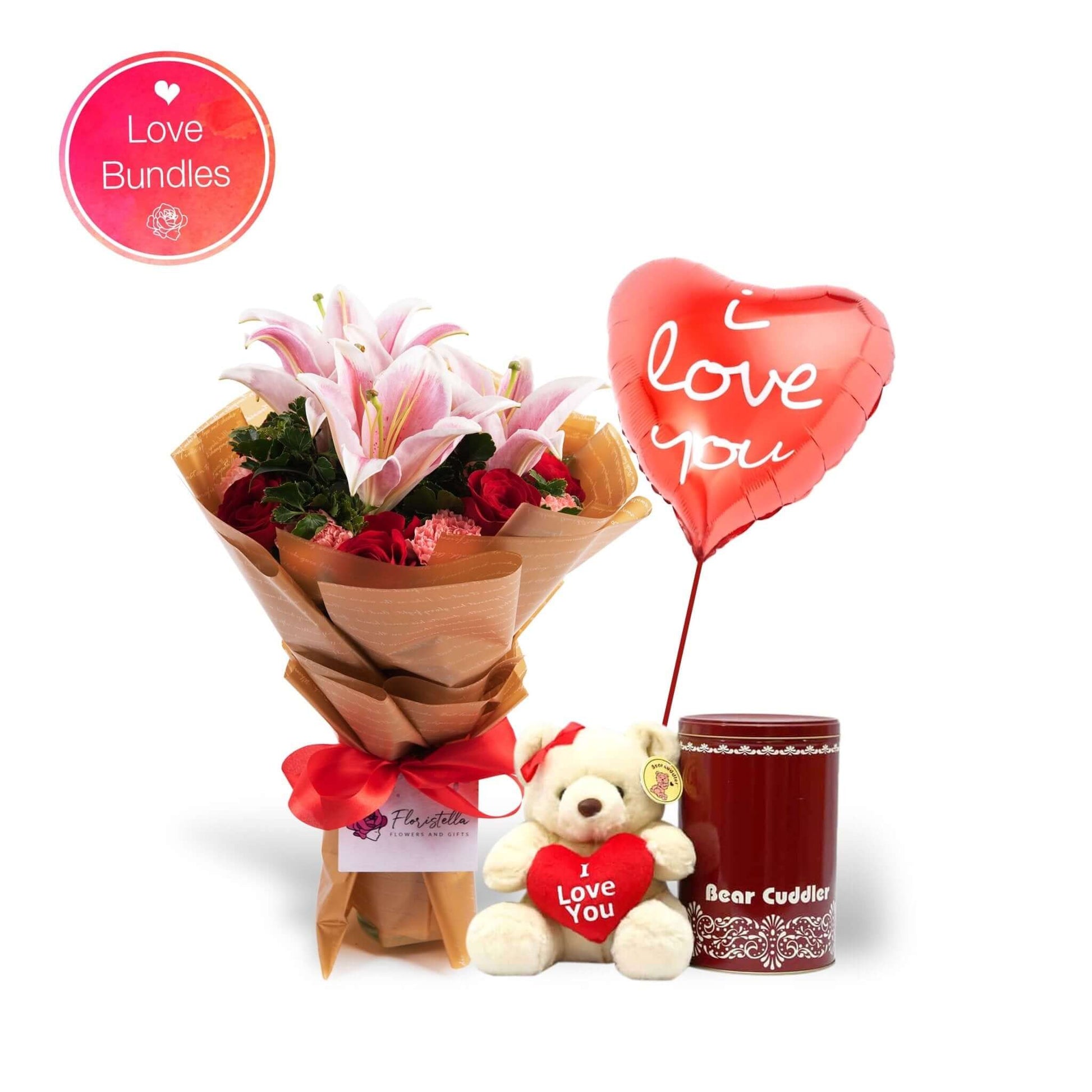 A Birthday Bundle of Love: Pink Lilies, Pink Carnations, Red Roses paired with an Angie Heart Teddy and 'I Love You' balloon. Perfect for birthdays.
