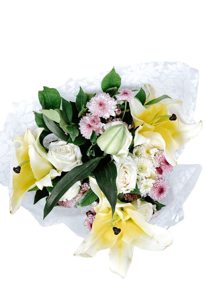 Check out this beautiful bouquet with lilies and white roses! It's like a serene garden captured in a bunch, perfect for birthdays, anniversaries, or any special occasion. Sending this floral arrangement is like delivering a message of love and tranquility. Let these flowers convey your heartfelt emotions, delivered fresh and fragrant to brighten someone's day!