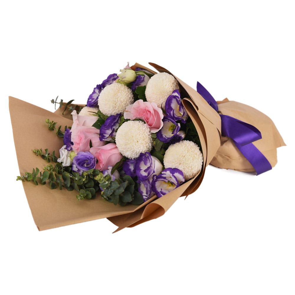 Gorgeous, fresh arrangement of Pink Roses, Purple Eustomas and White Pingpong flowers. Including lavish wrapping with luxurious paper, guaranteed to make the recipient smile. Suitable for many occasions such as birthday, romance, apologies, graduations or weddings days. One of our all-time bestsellers!