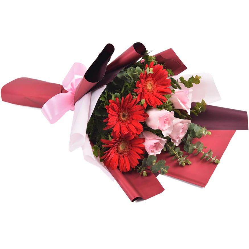 Blooms: Red Roses, Pink Roses, Eucalyptus Baby Blue & Fillers.