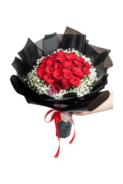 Arrangement Style: A luxurious bouquet of red roses, delicately accented with million star fillers to create an elegant expression of love.