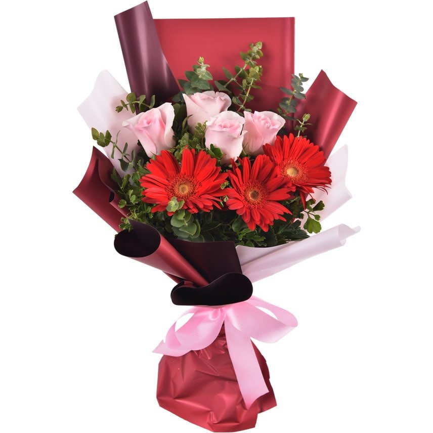 Blooms: Red Roses, Pink Roses, Eucalyptus Baby Blue & Fillers.